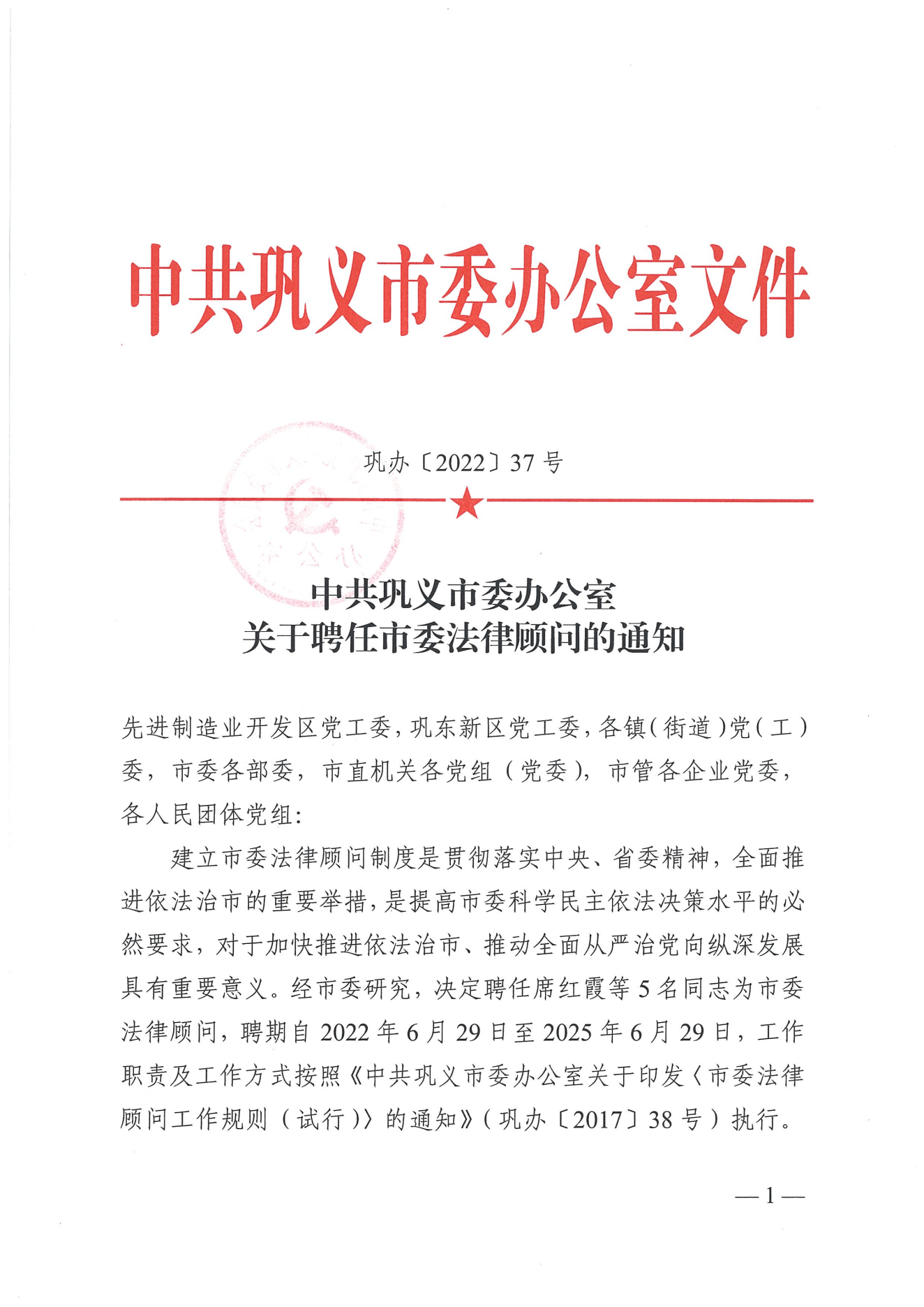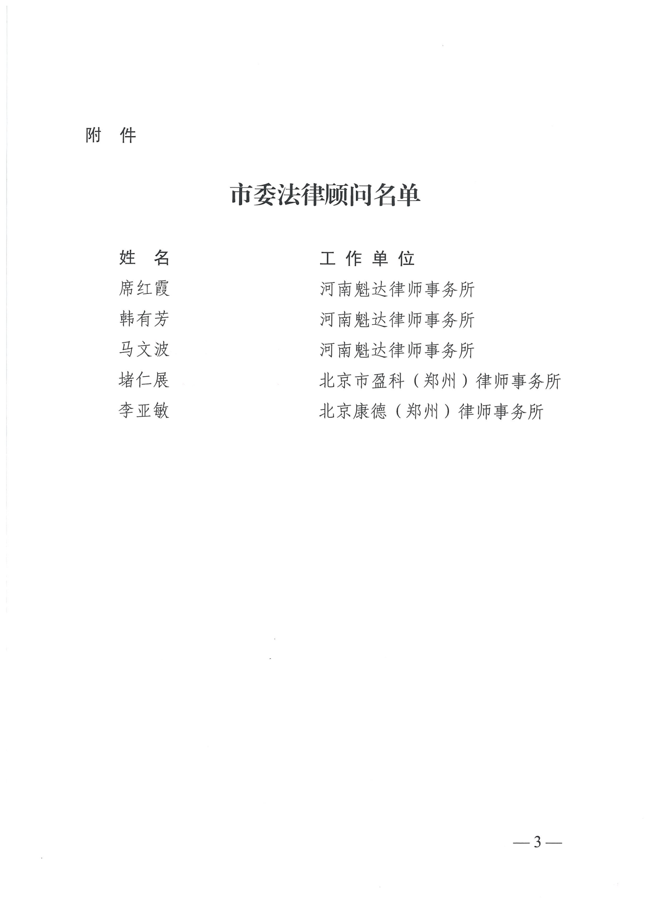 为贯彻落实中央、省委精神,全面推进依法治市的重要举措,提高市委科学民主依法决策水平,提高风险防控能力,充分发挥法律专家的专业优势, 中共巩义市委办公室特建立市委法律顾问制度,聘请我所李亚敏律师等五位律师担任巩义市委法律顾问,聘期自2022年6月29日至2025年6月29日。